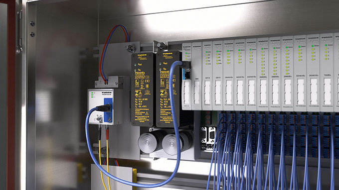 TURCK’s remote I/O system excom for ATEX Zone 1 transmits signals from intrinsically safe sensors and actuators in Zones 0 and 1 via Ethernet to the higher-level controller. Communication between the non-Ex and Ex areas is handled via fiber optics using TURCK’s media converters FOCEN11Ex-2G and FOCEN11-3G—across distances of up to 2,500 m. From this point, multiple excom stations can be integrated using the GEN-2G Ethernet Gateway over copper cables and communicate via PROFINET, EtherNet/IP or Modbus TCP.